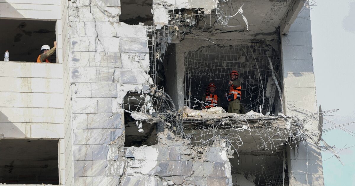تتلألأ من المعادن من القسم المتفحمة في مبنى شاهق في بيتا تيفكا بالقرب من تل أبيب ، حيث قام رجال الإنقاذ بعجلات المسنين بعيدًا عن الأضرار.
