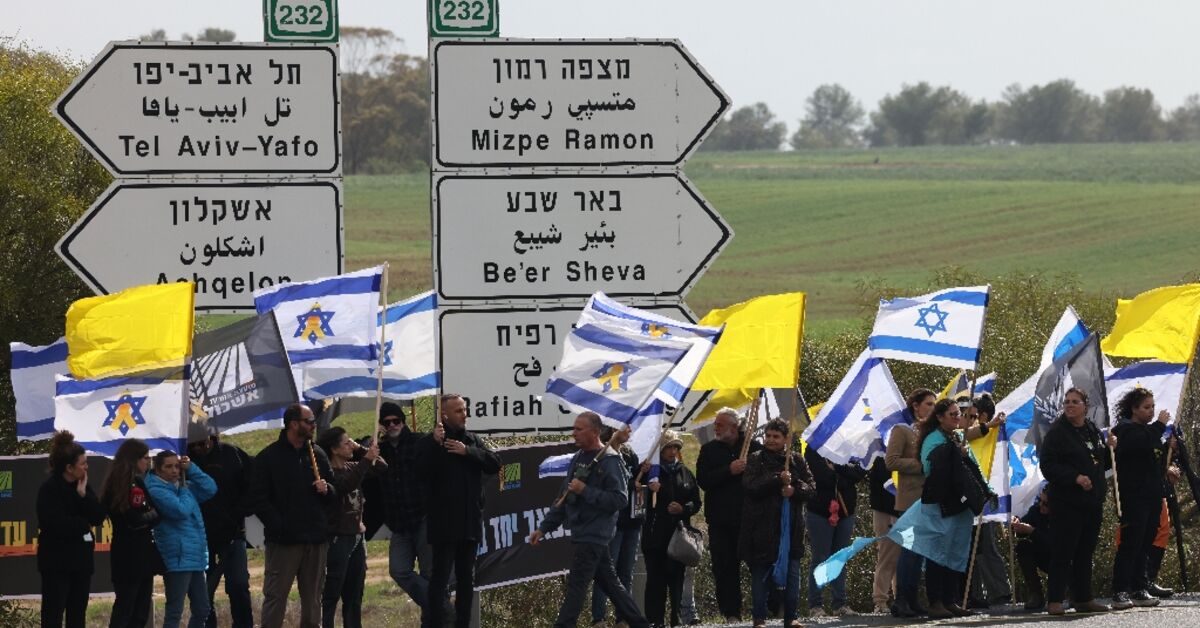 العشرات من الإسرائيليين الذين يلوحون بالأعلام تجمعوا تحت سماء عاصفة يوم الخميس يصطفون على طريق قافلة تجلب إلى المنزل أجساد الرهائن المتوفاة التي سلمتها حماس في غزة.