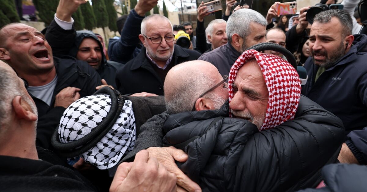 كان فاخري بارغوتي يعاني من الألم حيث رفعه حشد من الحشود على أكتافهم بجوار ابنه شادي ، الذي أطلق سراحه من سجن إسرائيلي يوم السبت في ظل صفقة وقف إطلاق النار في غزة.