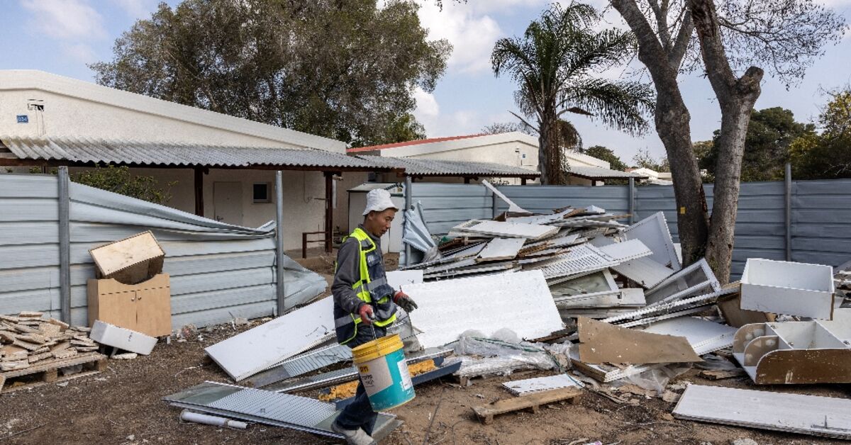 في Kibbutz Nirim ، من الصعب على حدود غزة ، فإن صوت المطارق يخترق الصمت الذي استقر على هذا المجتمع الزراعي الإسرائيلي الصغير منذ أن دخلت وقف إطلاق النار في 19 يناير.