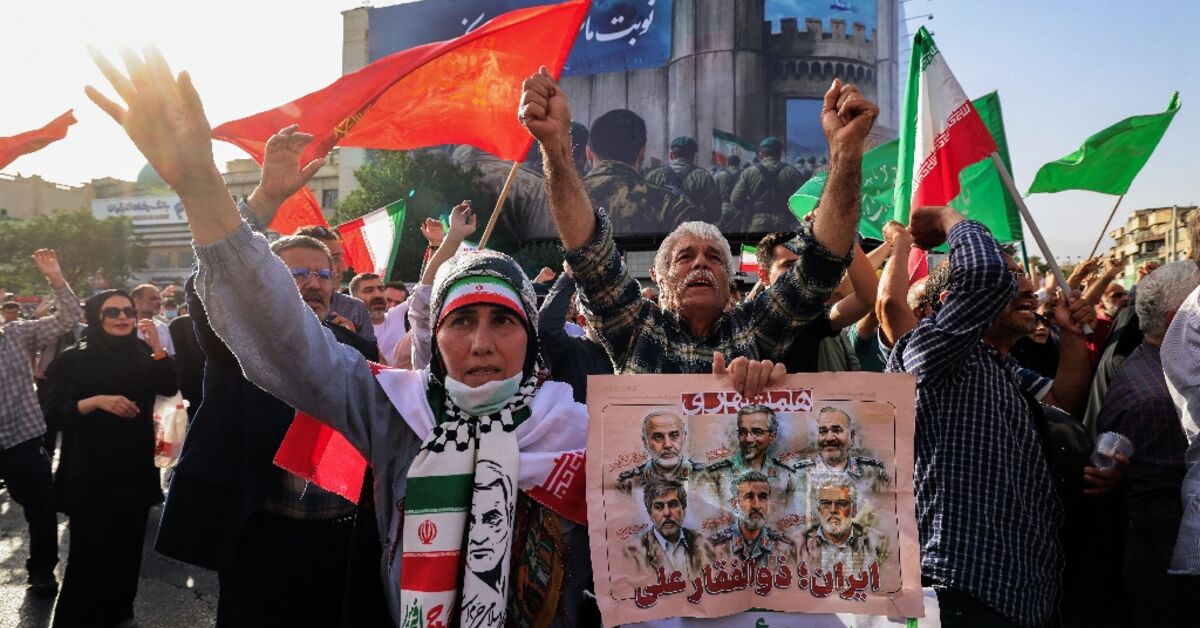 اجتمع الناس يوم الأحد في وسط طهران للاحتجاج على الهجمات الأمريكية والإسرائيلية ، ويلوحون بالأعلام وترديد الشعارات.