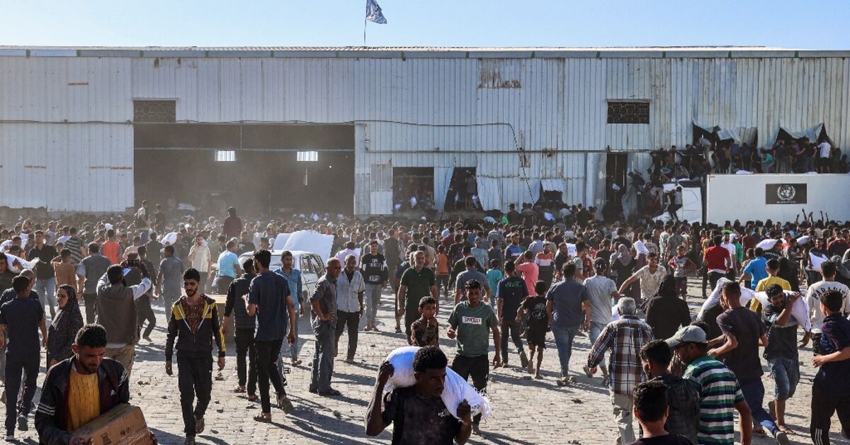 أظهر فيلم AFP حشودًا من الفلسطينيين الذين اقتحموا مستودعًا لبرنامج الأغذية العالمي (WFP) وأخذ أكياسًا وكرتونًا من الإمدادات الغذائية بينما تتأرجح طلقات نارية.