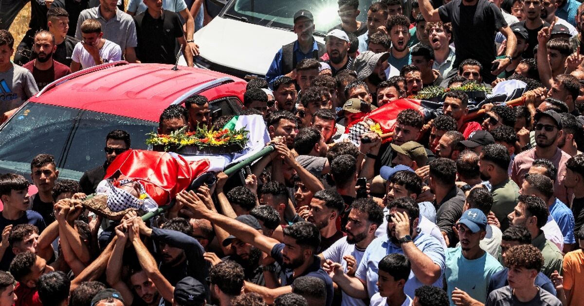 تم نقل جثة الفلسطينية السايف الدين عبد الكريم موسلا-المغطى بالعلم ومغطى بإكليل من الزهور الأصفر والبرتقالي-عبر شوارع المزررا المزدحمة في الضفة الغربية المحتلة يوم الأحد.