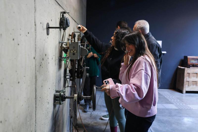 تضمن أحد التثبيتات المذهلة في المعرض جهازًا ميكانيكيًا مثبتًا على جدار خرساني مع التروس والسلاسل والعجلات والرافعة التي لعبت تسجيلات قديمة لأداة القطران الوتاب من خلال أجهزة الهاتف الرجعية.