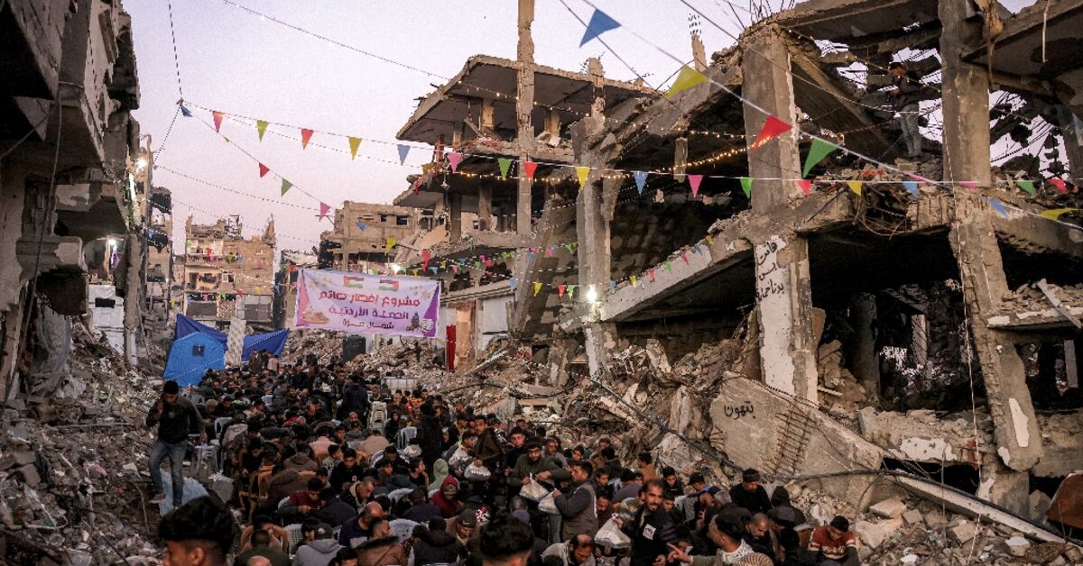 في مساء يوم السبت ، تجمعت غازانز وسط المباني المدمرة لتناول وجبة إفطار سريعة أثناء دخولهم رمضان الثاني تحت ظل الحرب.