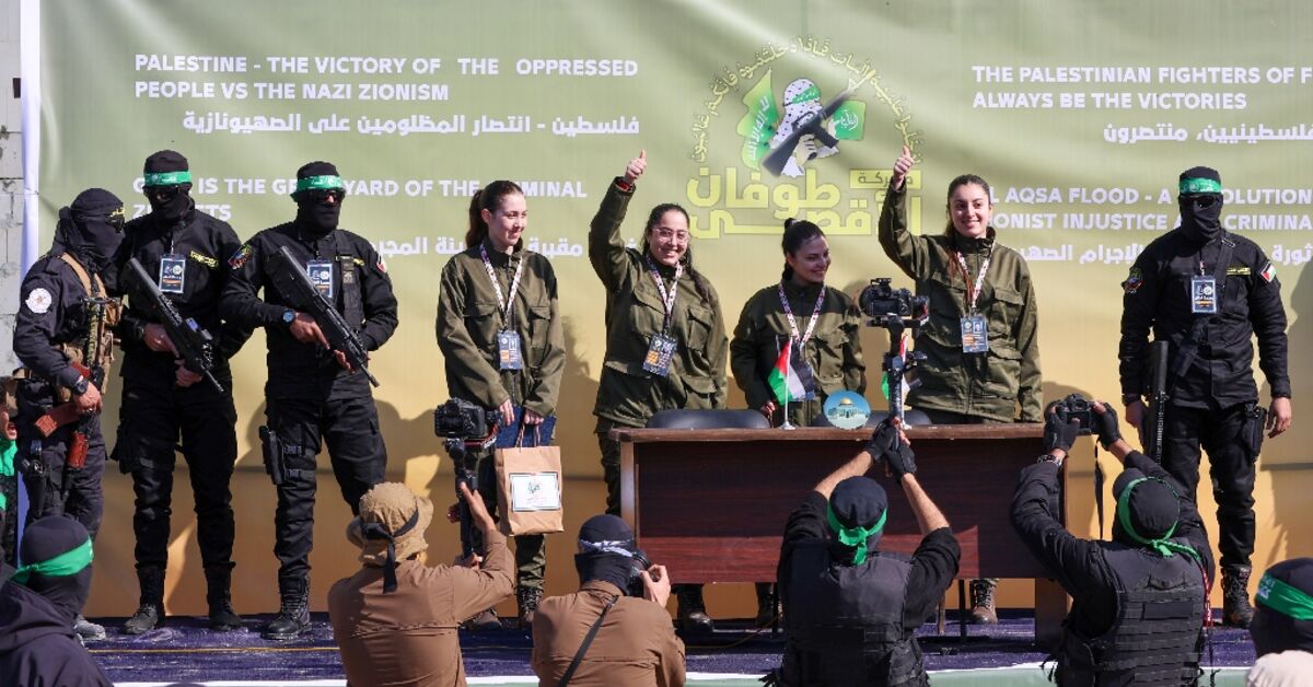 وكان الرهائن الإسرائيليون الأربعة الذين سلمتهم حماس يوم السبت للصليب الأحمر، وهم يحملون أكياس هدايا تحمل علامة حماس ويرتدون ملابس عسكرية، يلوحون بأصابعهم ويرفعون إبهامهم أثناء عرضهم على خشبة المسرح أمام عشرات المسلحين وحشد كبير من الناس.