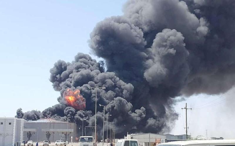 يمكن رؤية أعمدة الدخان المظلمة التي تخرج من محيط الميناء البحري الرئيسي في البلاد في المدينة حيث لجأ مئات الآلاف من النازحين.