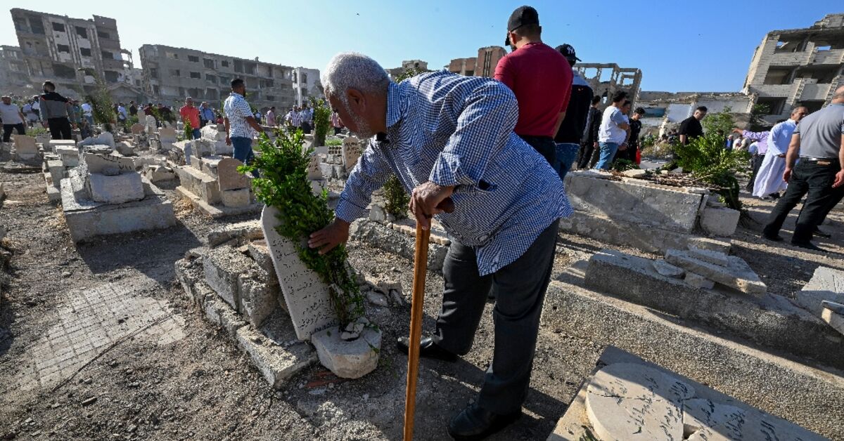 أظهرت المقبرة في ضاحية جوبار المدمرة في دمشق فقط علامات على الحياة يوم الجمعة حيث عاد السكان لزيارة ويصليون من أجل عيد الأماه ، الأول منذ سقوط بشار الأسد.