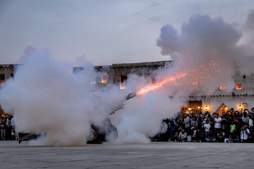 يطلق جنود القطريين المدفع الذي يحدد نهاية يوم الصيام الأخير من شهر رمضان المسلمين ويشيرون إلى أن يتناول الناس وجبة “الإفطار” السريعة ، في Souq Waqif Bazaar في الدوحة في 9 أبريل 2024 (تصوير Karim Jaafar/AFP عبر صور Getty)