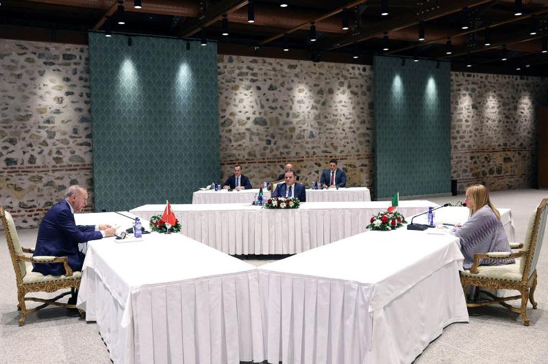 رحب الرئيس تاييب أردوغان رئيس الوزراء الإيطالي جيورجيا ميلوني ورئيس الوزراء الليبي عبد الله دبيبا باجتماع ثلاثي في النهاية تم الكشف عن تفاصيل قليلة.